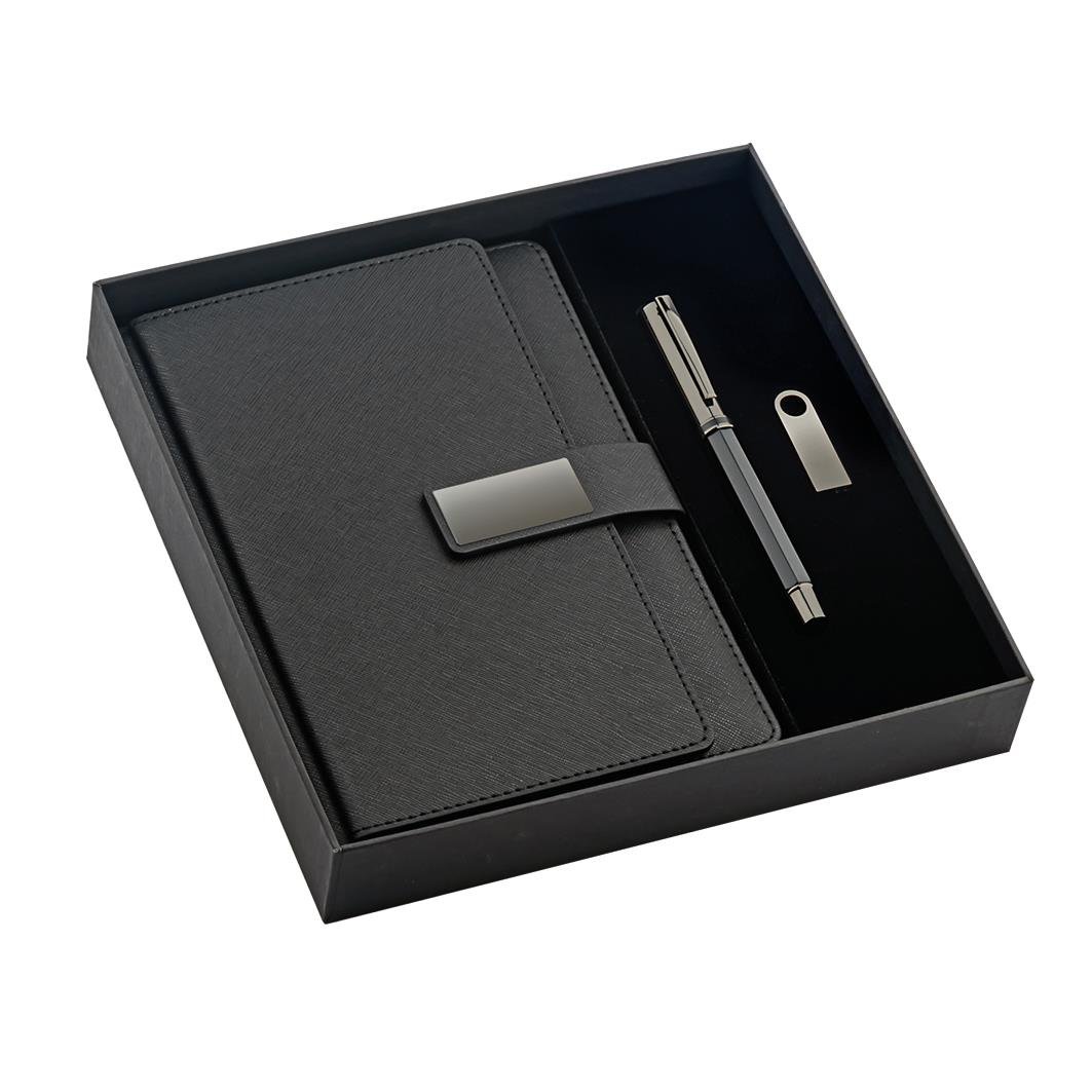 14,5 x 21 cm Termo Deri Defter, Metal Roller Kalem Metal Usb Bellek 16 GB, Karton Kutu